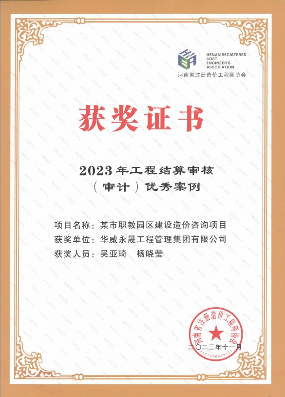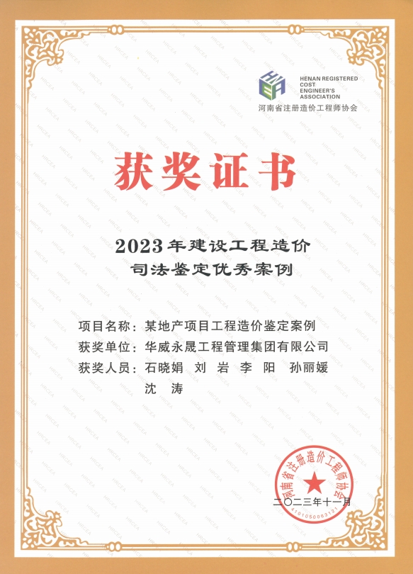 近日,我司榮獲河南省注冊造價(jià)工程師協(xié)會“2023年度先進(jìn)單位會員”稱號,《河南XX市XX路生態(tài)廊道建設(shè)造價(jià)咨詢項(xiàng)目》、《某市職教園區(qū)建設(shè)造價(jià)咨詢項(xiàng)目》、《某地產(chǎn)項(xiàng)目工程造價(jià)鑒定案例》三個(gè)項(xiàng)目被河南省注冊造價(jià)工程師協(xié)會評為優(yōu)秀案例。