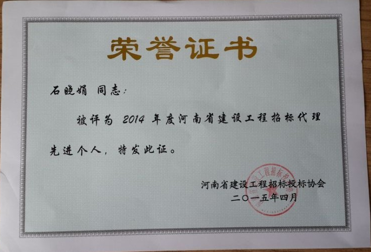2015年4月24日,河南省建設(shè)工程招標(biāo)投標(biāo)協(xié)會(huì)2015年年會(huì)暨表彰先進(jìn)會(huì)議在鄭州舉行。我公司榮獲2014年度招標(biāo)代理先進(jìn)單位、石曉娟被評為2014年度招標(biāo)代理先進(jìn)個(gè)人。