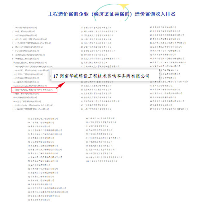河南華威公司位列2020工程造價(jià)咨詢企業(yè)造價(jià)咨詢收入17!連續(xù)兩年入圍全國(guó)百?gòu)?qiáng)排名20