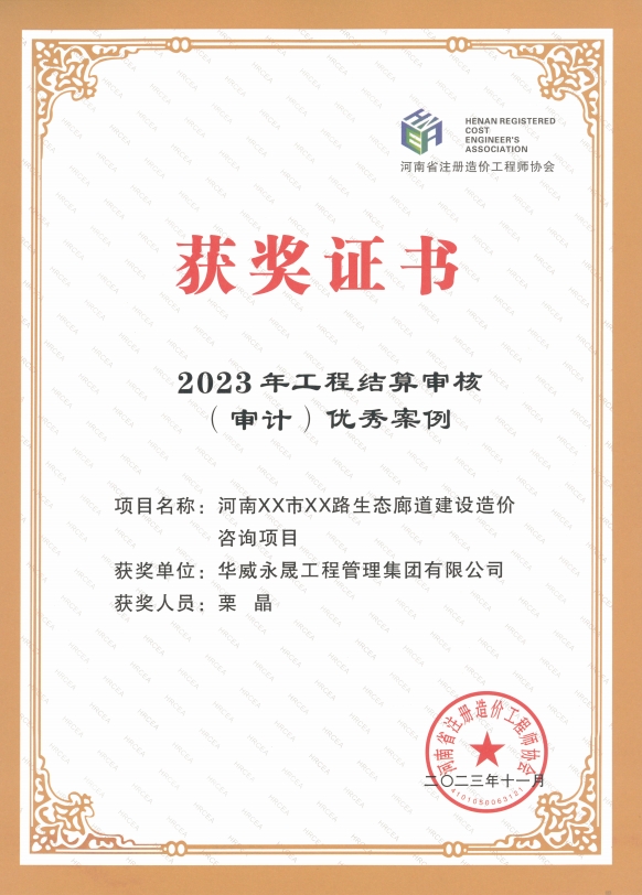 近日,我司榮獲河南省注冊造價(jià)工程師協(xié)會“2023年度先進(jìn)單位會員”稱號,《河南XX市XX路生態(tài)廊道建設(shè)造價(jià)咨詢項(xiàng)目》、《某市職教園區(qū)建設(shè)造價(jià)咨詢項(xiàng)目》、《某地產(chǎn)項(xiàng)目工程造價(jià)鑒定案例》三個(gè)項(xiàng)目被河南省注冊造價(jià)工程師協(xié)會評為優(yōu)秀案例。